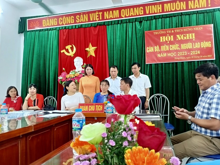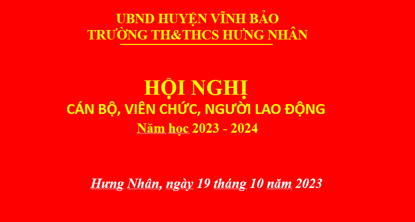 Thực hiện sự chỉ đạo của Phòng GD&ĐT, LĐLĐ huyện Vĩnh Bảo; thực hiện theo kế hoạch giáo dục nhà trường năm học 2023-2024. Ngày 19/10/2023, Trường TH&THCS Hưng Nhân long trọng tổ chức Hội nghị cán bộ, viên chức và người lao động năm học 2023-2024. Đây là một trong những hoạt động có ý nghĩa, quan trọng của nhà trường, là dịp để nhà trường tổng kết, đánh giá lại phong trào thi đua dạy và học năm học 2022-2023 và đặt ra phương hướng phấn đấu cho năm học mới 2023-2024.
